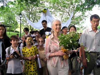 jane Goodall with volunteers in her Roots and Shoots program, which engages children in solving social and environmental problems.